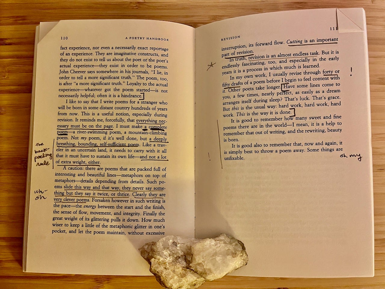 Okay. I said I would be “testing” Mary Oliver’s advice and ideas from A Poetry Handbook, and the only way I know how to do that is to annotate. Marginalia is my drug of choice; if I could somehow turn all my annotating into tattoos, I’d be the new Illustrated Man. My habit and practice is almost entirely refined and individualized from years of teaching high school students how to eat their books the way William Blake did. If you aren’t writing on what you’re reading, you aren’t reading.